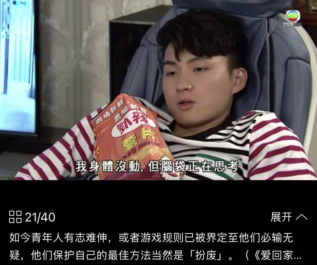 香港年轻人非常喜欢本地电视剧《爱回家》的这个颓废剧照,并以此自命,颇有点类似于大陆的葛优瘫当时香港媒体对“废青”这个名词进行了诸多报道,观点褒贬不一,但都有一个相同的定性:那就是由于香港房价的不断攀升,越来越多的新一代香港年轻人已经放弃了买房上车的希望了,即他们对现有的经济秩序逐渐失去信心(香港年轻人一半的薪水要交付给房东,买房也无希望)